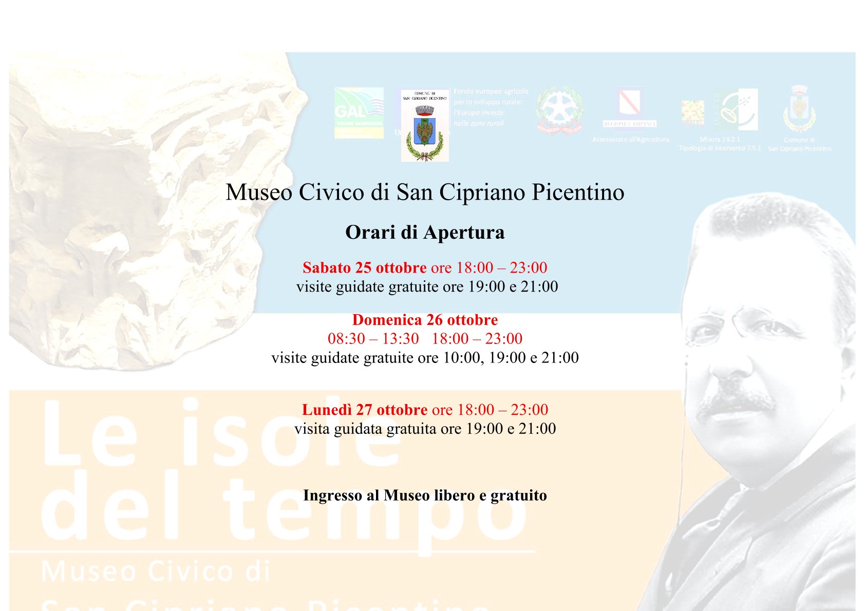 Considerata l'opportunità di promuovere e valorizzare il Patrimonio Culturale custodito nel Museo Civico di San Cipriano Picentino in vista dell'affluenza di escursionisti e turisti nella manifestazione denominata la Sagra della Castagna che si terrà a San Cipriano Picentino dal 24 al 27 ottobre 2025; ravvisata, quindi, la necessità di programmare l'apertura straordinaria e gratuita di detto Museo anche con visite guidate, si dispone l'apertura straordinaria del Museo Civico di San Cipriano Picentino nelle giornate 25, 26 e 27 ottobre 2025 secondo i seguenti orari: