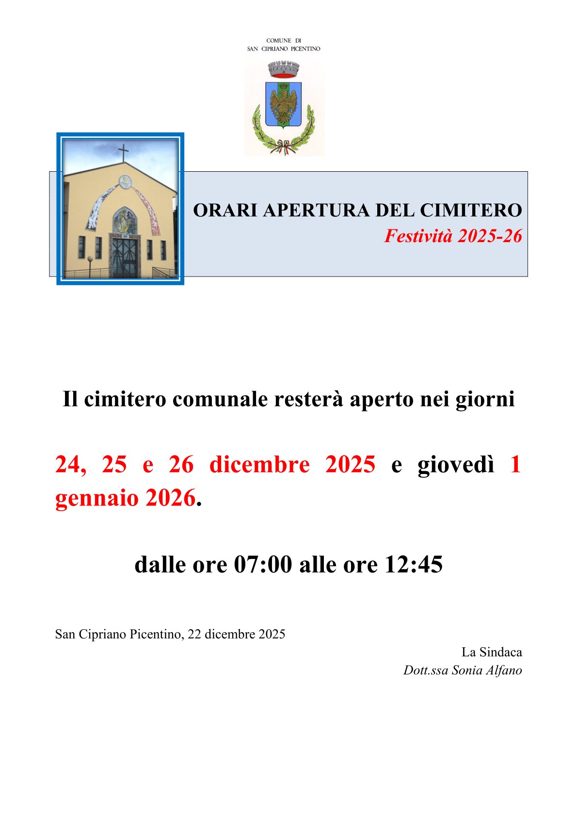 Orari di apertura del Cimitero comunale durante il periodo delle festività natalizie.